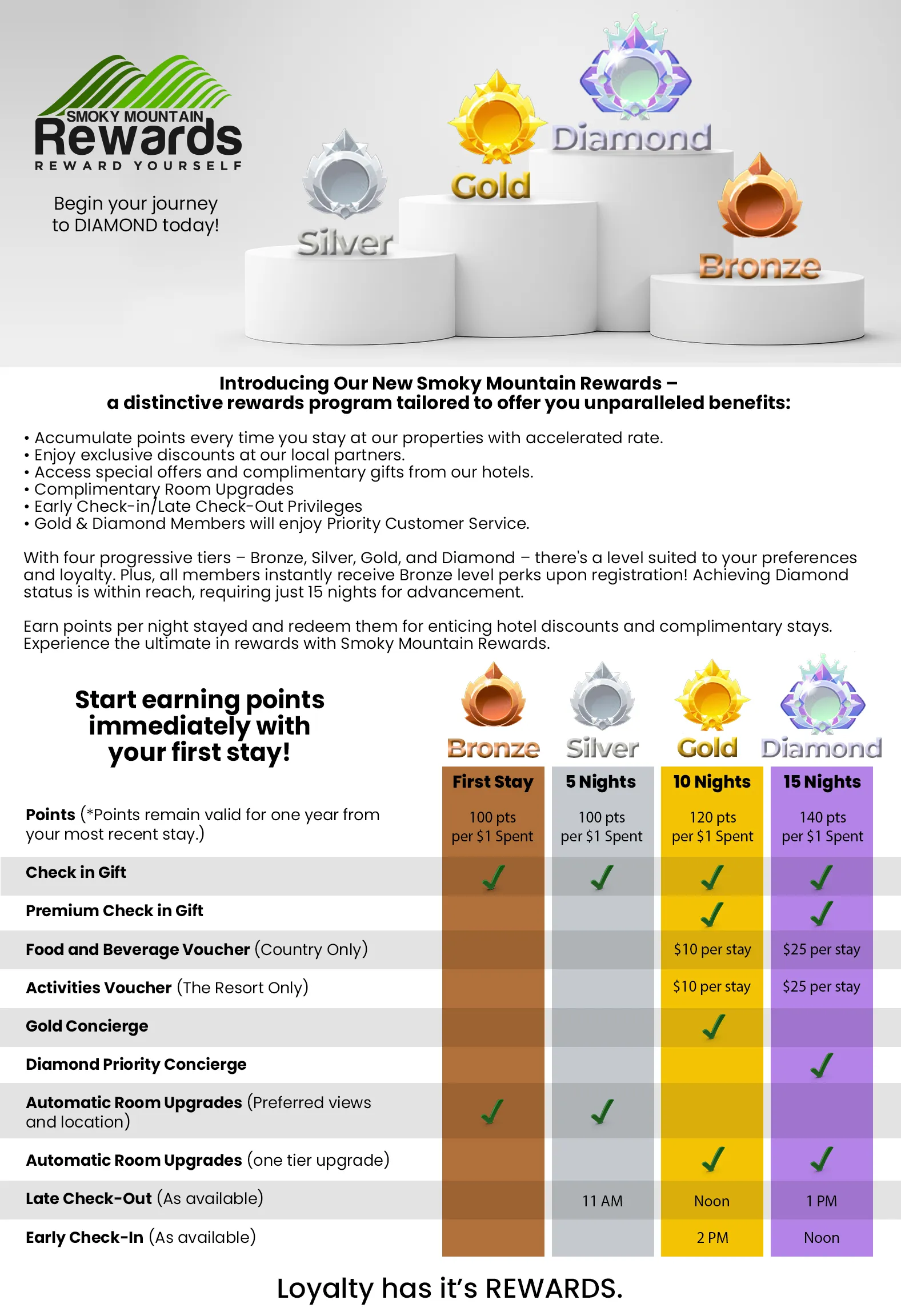Every stay brings you closer to exclusive perks with Smoky Mountain Rewards! Earn points on every dollar spent and unlock exciting benefits like complimentary room upgrades, early check-in/late check-out, and special gifts. With four tiers – Bronze, Silver, Gold, and Diamond – you’ll enjoy more rewards the more you stay, from food and beverage vouchers to premium concierge service. Reach Diamond in just 15 nights and experience VIP treatment every visit.